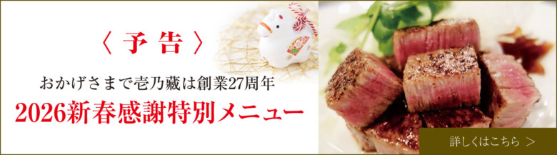 【創業28周年】2026新春感謝特別コースのご案内(1月8日~2月末日まで) おかげさまで壱乃藏は、2026年をもちまして創業28周年を迎えることとなりました。 これまで多くのお客さまに支えられ、記念日のお食事やご接待、…