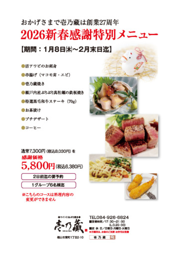 【創業28周年】2026新春感謝特別コースのご案内(1月8日~2月末日まで) おかげさまで壱乃藏は、2026年をもちまして創業28周年を迎えることとなりました。 これまで多くのお客さまに支えられ、記念日のお食事やご接待、…