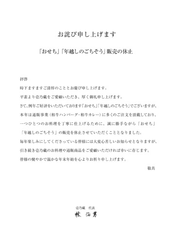 拝啓 時下ますますご清祥のこととお慶び申し上げます。 平素より壱乃藏をご愛顧いただき、厚く御礼申し上げます。 さて、例年ご好評をいただいております「おせち」「年越しのご馳走」でございますが、 本年は通販事業(和牛ハンバ…