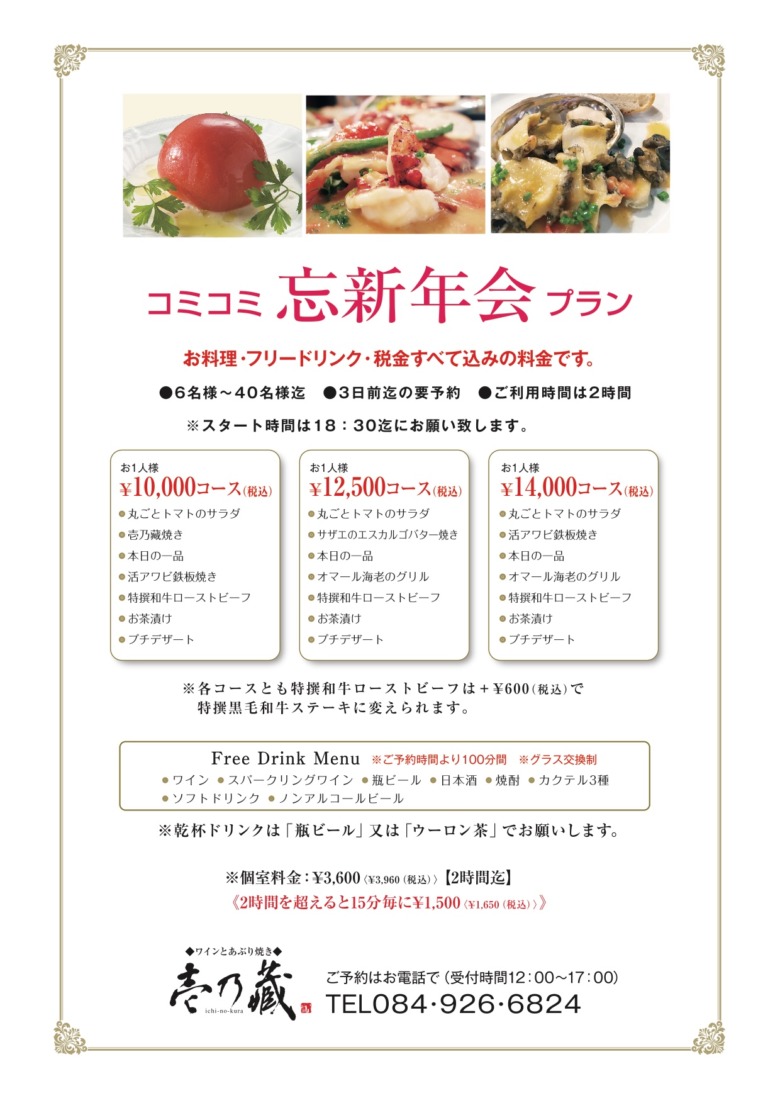お飲み物はワイン・スパークリングワイン・日本酒・焼酎・カクテル・ビールなど豊富に揃えたフリードリンクをご用意。美味しい料理とお酒を囲みながら、忘れられないひとときを演出いたします。2025年の締めくくりと2026年の幕開けを、壱乃藏の特別なおもてなしでお過ごしください。