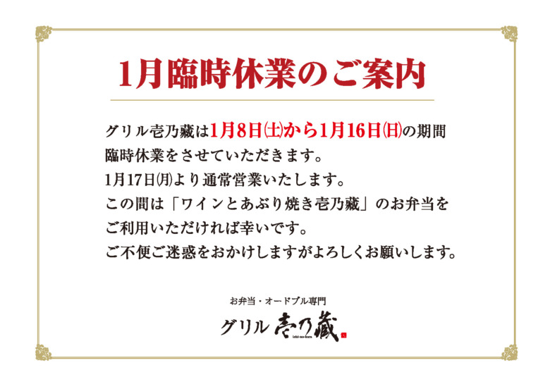 臨時休業のお知らせ 「グリル壱乃藏」「ワインとあぶり焼き壱乃藏」では下記の期間は臨時休業させて頂きます。 お客様にはご不便ご迷惑をおかけ致しますが、何卒よろしくお願い致します。 ◆グリル壱乃藏 1月8日(土)〜1月16日(日) ◆ワインとあぶり焼き壱乃藏 1月17日(月)〜1月25日(火) ※クリックで拡大表示されます。